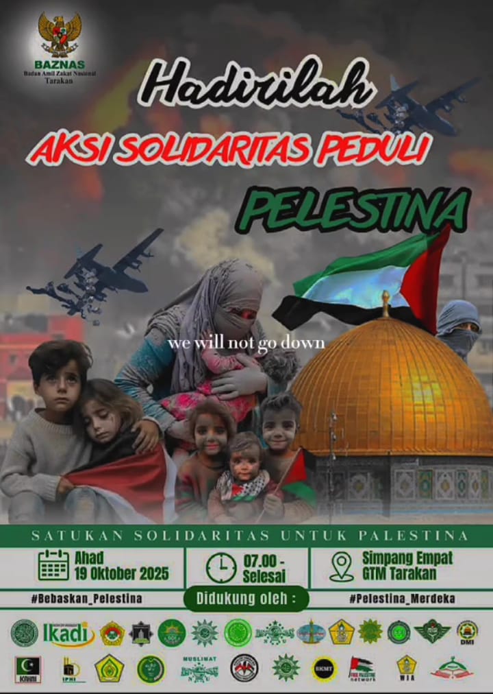 TARAKAN – Minggu pagi, 19 Oktober 2025, simpang empat Grand Tarakan Mall (GTM) akan menjadi pusat kepedulian dan suara nurani warga Kota Tarakan. Ratusan orang dari berbagai kalangan dan organisasi masyarakat dipastikan tumpah ruah mengikuti “Aksi Solidaritas Peduli Palestina”, sebuah gerakan kemanusiaan yang digagas oleh Badan Amil Zakat Nasional (BAZNAS) Kota Tarakan.