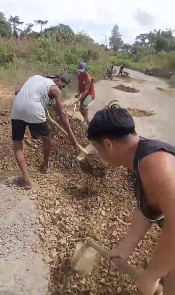 Bersama puluhan warga RT 01, pada Jumat Siang (17/10/25), Jones Lasung menggerakkan kerja bakti untuk menimbun lubang-lubang di sepanjang jalan poros provinsi. Dengan peralatan sederhana dan bahan seadanya, mereka menutup titik-titik rawan agar pengendara bisa melintas dengan aman.